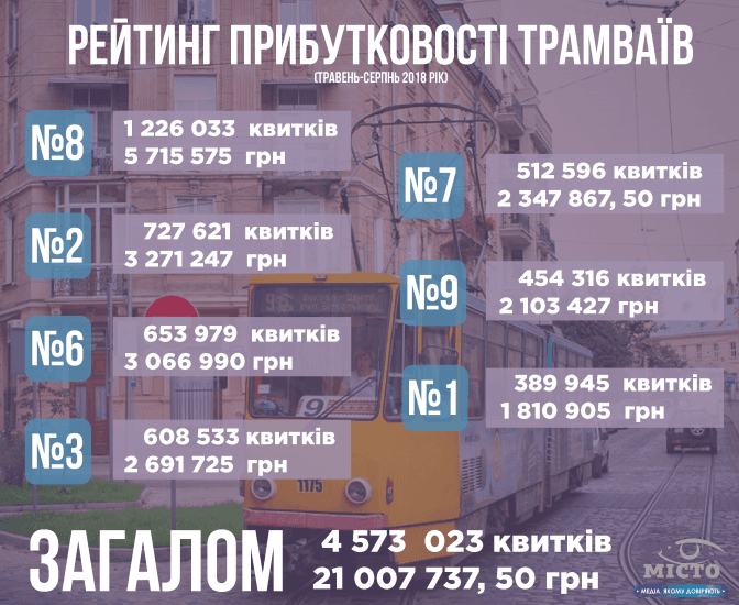 У квітні цього року ЛКП «Львівелектротранс» підвищив вартість квитків на проїзд у трамваях і тролейбусах: із 3 до 5 гривень за загальний квиток та з 1,50 до 2,50 грн – за пільговий квиток. У відповіді на запит Tvoemisto.tv підприємство надало інформацію про кількість коштів, які заробляє ЛКП від продажів квитків та абонементів у салонах, кіосках та з допомогою електронних систем. Tvoemisto.tv склало рейтинг трамвайних та тролейбусних маршрутів за рентабельністю. Для вибірки рахували кількість проданих у салоні квитків за чотири місяці після подорожчання проїзду (травень – серпень) на кожному з маршрутів, а також загальну кількість доходів від продажу проїзних документів із різними способами оплати.