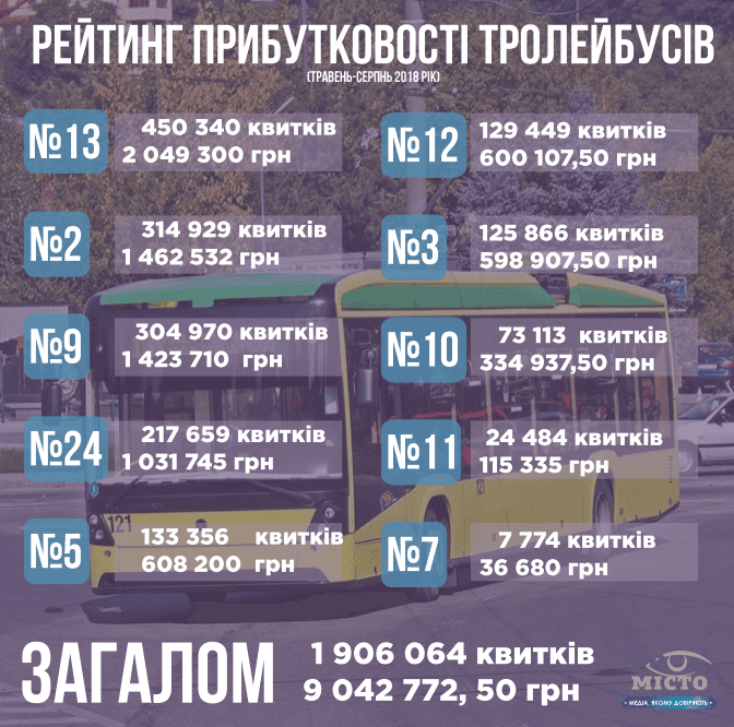 Найприбутковіший маршрут №13, який курсує від пл. Івана Підкови до вул. Грінченка, заробив понад 2 млн гривень та перевіз 450 тис. пасажирів.