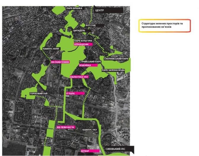 У Львові є чимало зелених зон та лісопарків. Але є райони, де озеленення бракує. Тому, наприклад, громадська організація Urbanideas запропонували зв’язати центр міста із Сиховом 9-кілометровим екомаршрутом. Він є велосипедно-пішохідний та поєднує багато зелених зон. Цю відстань можна буде пройти пішки за 75-90 хв або проїхати велосипедом за 30 хв.