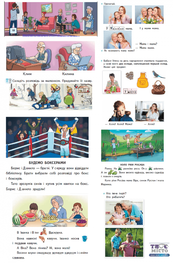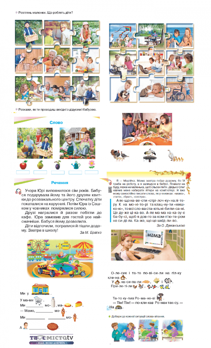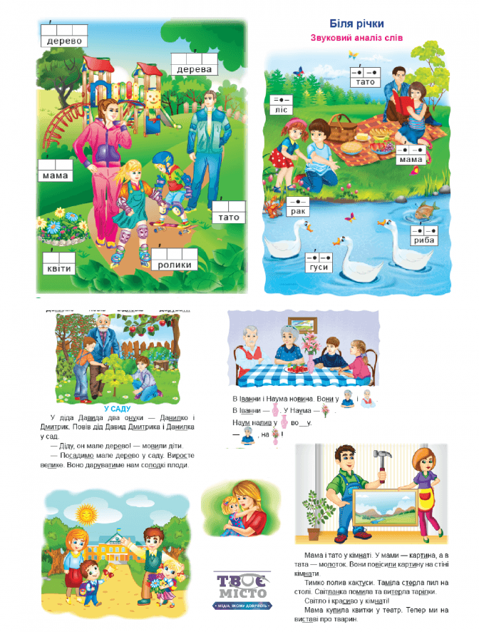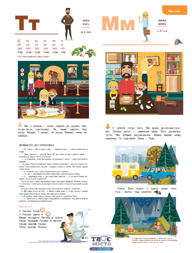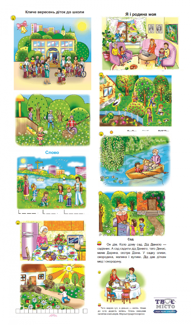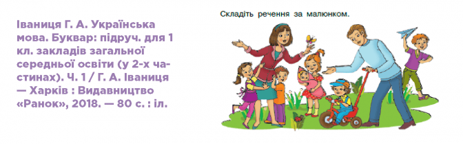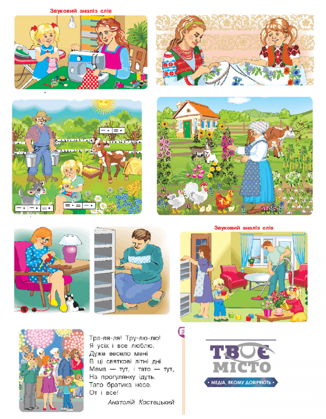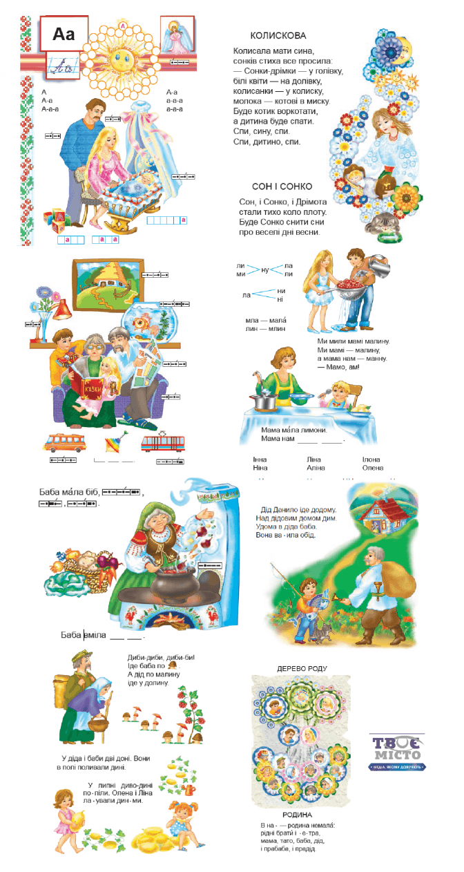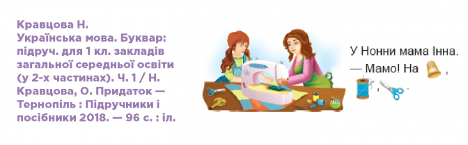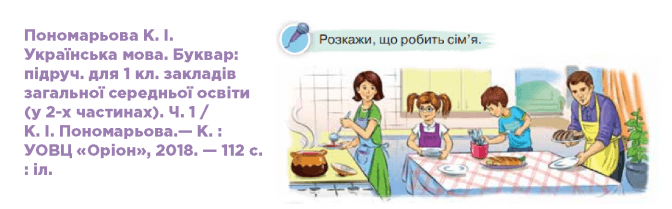 Дев’ятнадцять разів згадується сім’я у букварі Надії Кравцової та Ольги Придаток. Мама і тато, бабуся і дідусь згадуються порівну, по 7 та по 5 разів відповідно. Сім’я разом займається спортом та подорожує, але мама не може займатися домашніми справами без фартушка чи обійтися без швейної машинки.