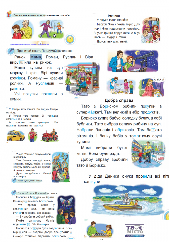 Члени сім'ї часто взаємодіють між собою: готують разом обід чи вирушають на природу. Бабуся займається вишиванням та садівництвом, водить онуків у музей, дідусь рибалить і ходить катером по Дніпру разом з онуком і онучкою. Тато з донькою грає в шахи, ходить з дітьми на бокс та допомагає освоїти телескоп. Правда, на сторінках 88 і 89 татусі розповідають про свої професії, а згадок чим, окрім родини, займаються матусі – немає.