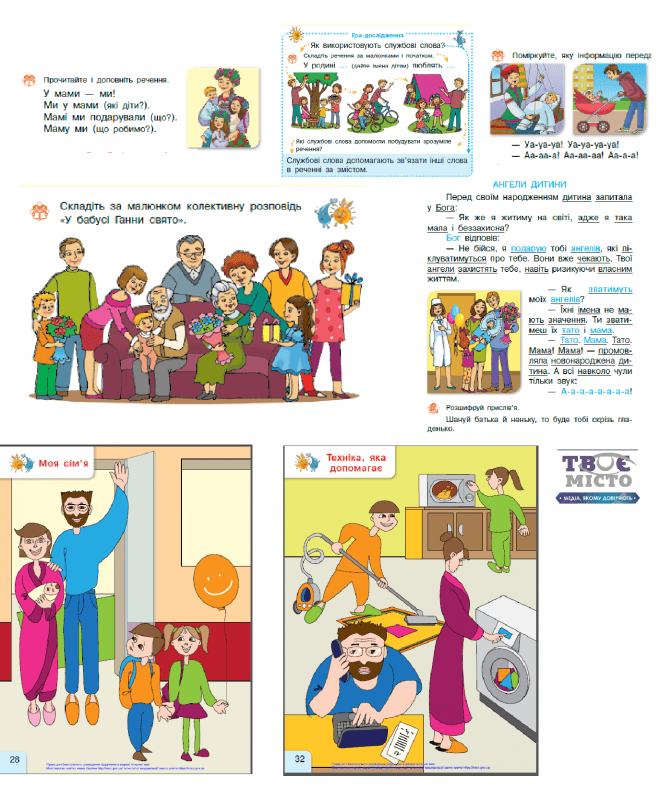 Тричі в підручнику демонструється нетипове виконання сімейних обов'язків: тато доглядає за немовлям, вся родина йде в похід і катається на велосипедах. Також на сторінці 31 зображено велике традиційне родинне святкування. А ще тут є оповідання про Леоніда Каденюка.