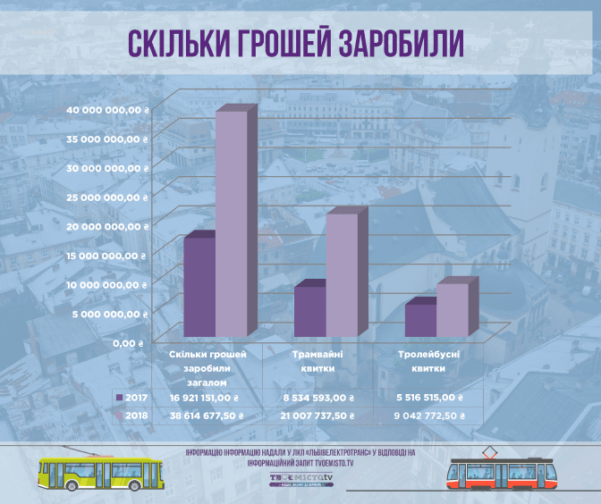 Із травня по серпень 2018 року на квитках та абонементах ЛКП «Львівелектротранс» заробило 38,6 млн гривень, продавши понад 7,8 млн квитків (у водія, у кіосках та за допомогою електронних пристроїв), що майже на мільйон менше, ніж торік. А от коштів, які підприємство отримало від продажу квитків та абонементів у 2018 році виявилось у двічі більше, ніж у 2017.