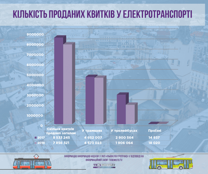 Із травня по серпень 2017 року на продажі квитків ЛКП «Львівелектротранс» заробив понад 16,9 млн гривень і перевіз 8,5 млн пасажирів із квитками. У трамваях придбали 4,6 млн квитків, у тролейбусах – майже 3 млн квитків. Щодо абонементів, то загалом у період із травня по серпень торік придбали майже 15 тисяч загальних та пільгових абонементів.