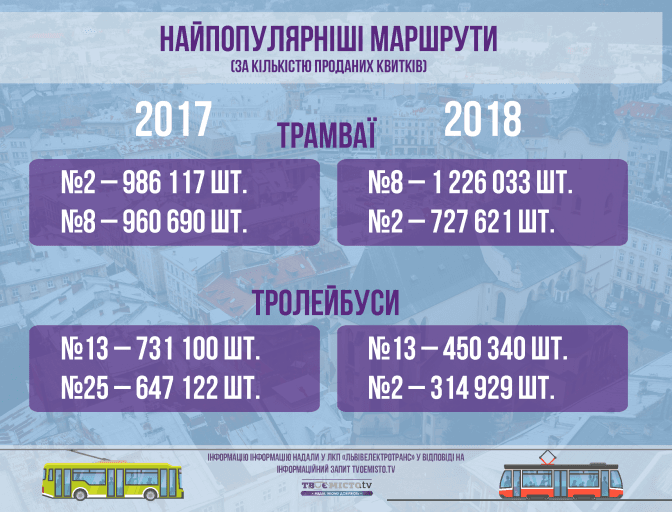 У салонах трамваїв водії продали приблизно 4,5 млн квитків, а у тролейбусах – майже 2 млн. Із травня по серпень львів'яни придбали понад 18 тисяч проїзних, що на три тисячі більше, ніж торік. За кількістю проданих квитків у салонах найпопулярнішими трамвайними маршрутами Львова залишився восьмий та другий, однак продаж квитків у восьмому трамваї за цей час перевалив за мільйон. Серед тролейбусів львів’яни найчастіше користуються маршрутом №13 та №2.