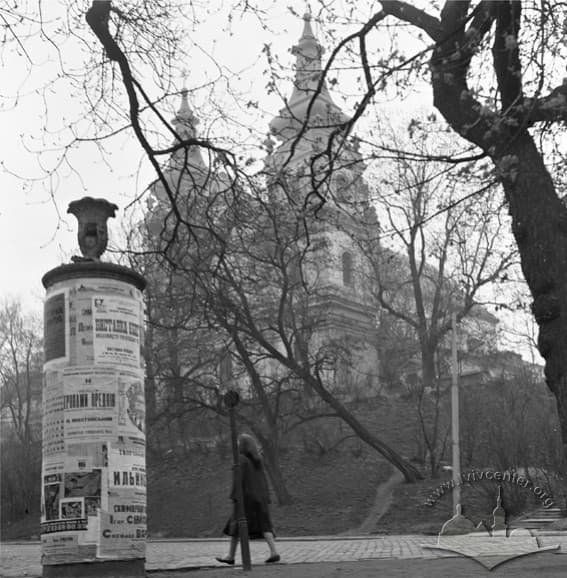 Вежа, яку бачимо на фото, споруджена у 1835 р. за проектом архітектора Алоїза Вондрашки. Під час реставрації на початку ХХ ст. у 1906 р. за проектом арх. Владислава Галицького споруджено другу вежу. Під горою бачимо череду фіакрів - це одне з офіційно затверджених місць постою пасажирських фіакрів.