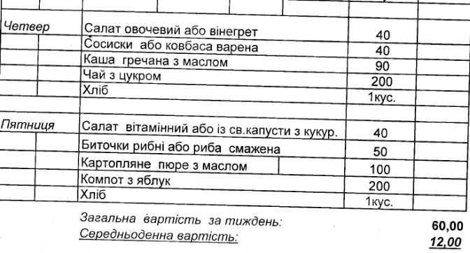 За ці гроші дітям пропонують меню, основою якого є макарони (зрідка – з твердим сиром), картопля, гречка, капуста, бурячки, часом – квашений огірок, хліб, какао з молоком, завжди – багато чаю з цукром. У меню не зазначають сортів пшениці, з якої виготовлені макарони, не пишуть, чи цільнозернові крупи використовують для приготування каш та який хліб дають дітям.