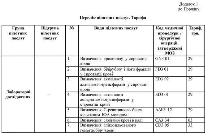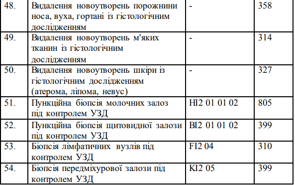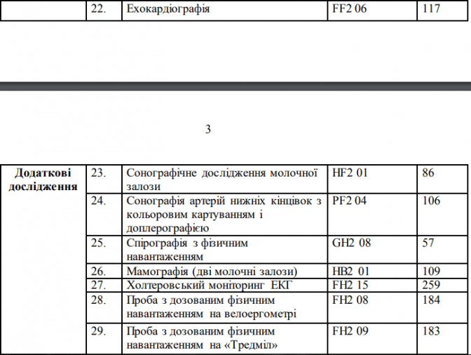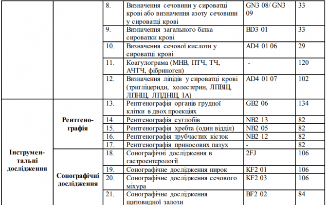 Ідеться про перелік з 54 послуг: 12 нових аналізів – додатково до 8 базових, які вже оплачує НСЗУ сімейному лікарю, терапевту, педіатру; мамографія; п'ять видів рентгену – грудна клітка, суглоби, хребет, кістки і приносові пазухи; ехокардіографія, моніторинг ЕКГ і два види тесту для визначення патологій серцево-судинної системи; шість видів УЗД – шлунково-кишковий тракт, нирки, сечовий міхур, артерії ніг, щитоподібна і молочні залози; чотири види біопсії під контролем УЗД – щитоподібної залози, лімфатичних вузлів, молочних та передміхурової залоз; видалення новоутворень – м’яких тканин і шкіри у носі, гортані, вухах.