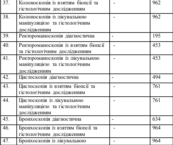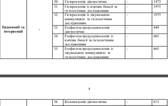 Також «Безкоштовна діагностика» включатиме ендоскопічні дослідження і операції одного дня: стравоходу, шлунку, дванадцятипалої і товстої кишки, сечового міхура, трахеї і бронхів. Детальніше про послуги і тарифи на них – у таблиці.
