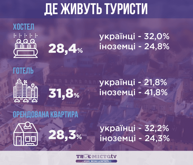 Є декілька варіантів, де живуть гості – готелі, хостели, орендовані квартири, хтось зупиняється у друзів чи родичів. Найбільша кількість іноземців проживає в готелях, 41,8% українців надають перевагу хостелам, адже вони дешевші.