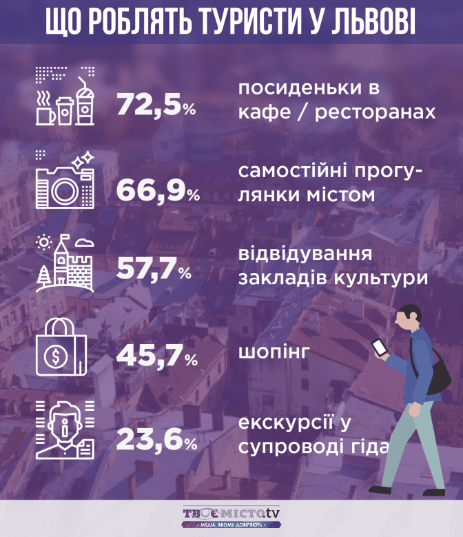 43% усіх гостей міста – гості з України, здебільшого молодь. Вони часто повертаються до Львова двічі чи навіть тричі за рік, адже не встигають все одразу обійти. На другому місці – поляки, на третьому – білоруси.