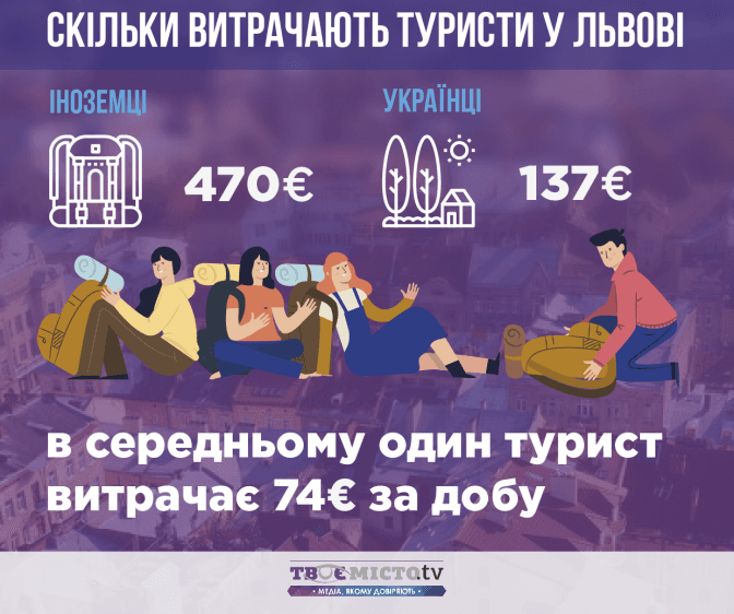 Українці витрачають 137 євро за весь час перебування. Іноземці – близько 470 євро, включаючи проживання, харчування, екскурсії. В середньому турист витрачає у Львові 74 євро за одну добу.