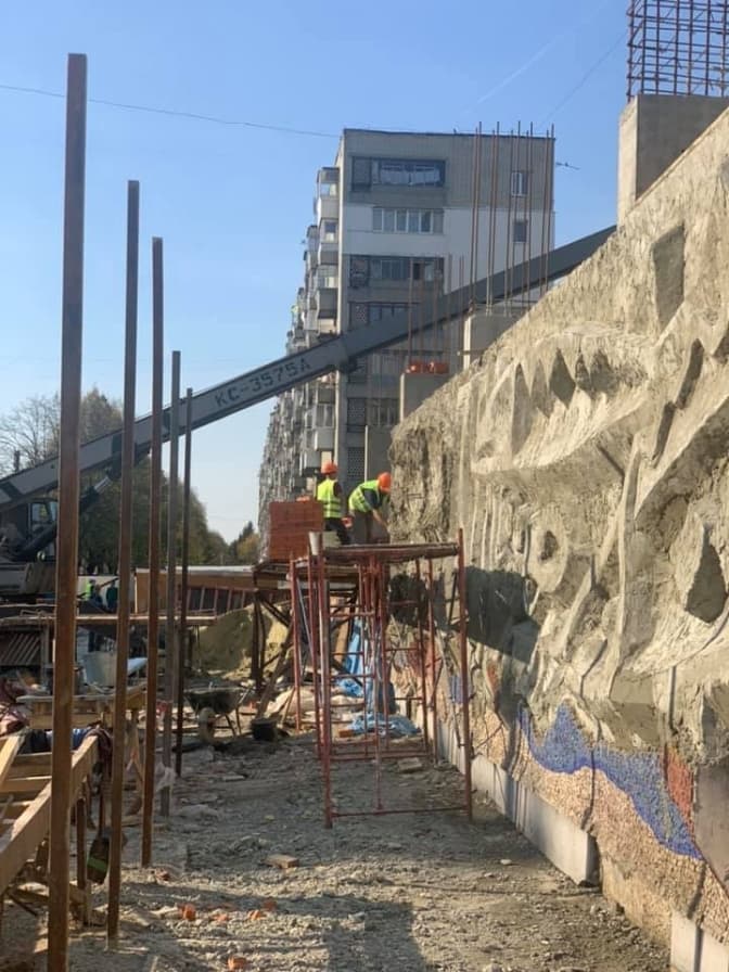 Саму стіну збудували з цегли, а поверх нанесли каркас для об’ємної мозаїки з бетону. Мозаїку ж вкладатимуть на завершальному етапі. Після стіни забудовник зможе почати будівництво решти будівлі.