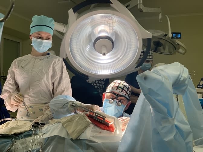 Пацієнту провели складне хірургічне втручання – аорто-мамарокоронарне шунтування і протезування мітрального клапана – під час якого зупиняли серце та використовували апарат штучного кровообігу. Кардіохірурги в обхід бляшок нашили шунти, через які відновили кровообіг в ділянки серця. Для цього взяли два шматочки вени з правої ноги пацієнта та внутрішньогрудну артерію. Операція тривала 4,5 години.