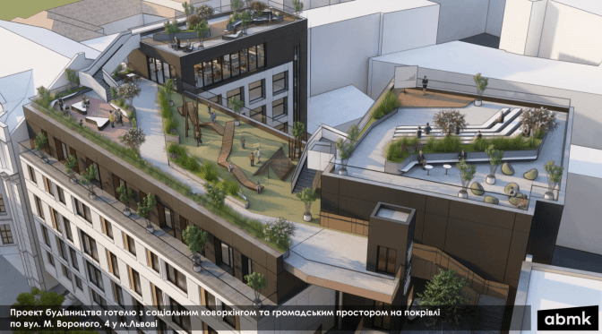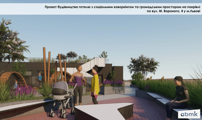 Команда архітекторів бюро «АБМК» представила концепцію нової будівлі, яка має з’явитись на місці хаотичного паркувального майданчику на вулиці Вороного, 4. Проект передбачає будівництво дворівневого підземного паркінгу, а також облаштування скверу, дитячого майданчика, літнього театру та соціального коворкінгу на даху будівлі. Відкриті громадські простори займуть більше 1000 кв. м та будуть загальнодоступними для львів’ян. На дах вестимуть окремі ліфт та сходи, які, разом із проміжними терасами, перетворяться на постійну мистецьку галерею.