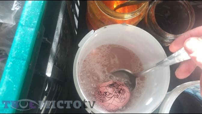 Після нанесення воском першого малюнку, яйце потрібно витравити. Хлорку розчиняють у воді і занурюють туди майбутню писанку. Всі узори нанесені воском залишаються, а зайва фарба зникає.