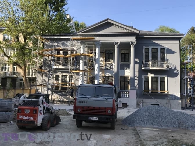 Зараз відбувається очищення віконних відксів від попередньої фарби. На об'єкті також працюють технологи, допомагають підібрати необіхдні матеріали для правильної реставрації будинку. Компанія, за слвоами Святослава, має досвід і робить це не вперше.