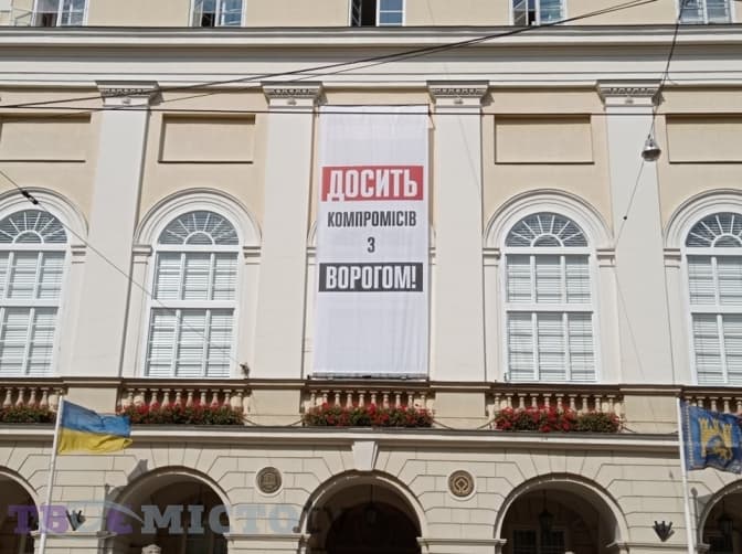 Також сьогодні на львівській Ратуші вивісили банер «Досить компромісів з окупантом».Оскільки банер без підпису, Тvoemisto.tv дізнавалося, за чиї кошти друкували банер і чию позицію висвітлює – мера, міськради, партії «Самопоміч» чи громади Львова.
