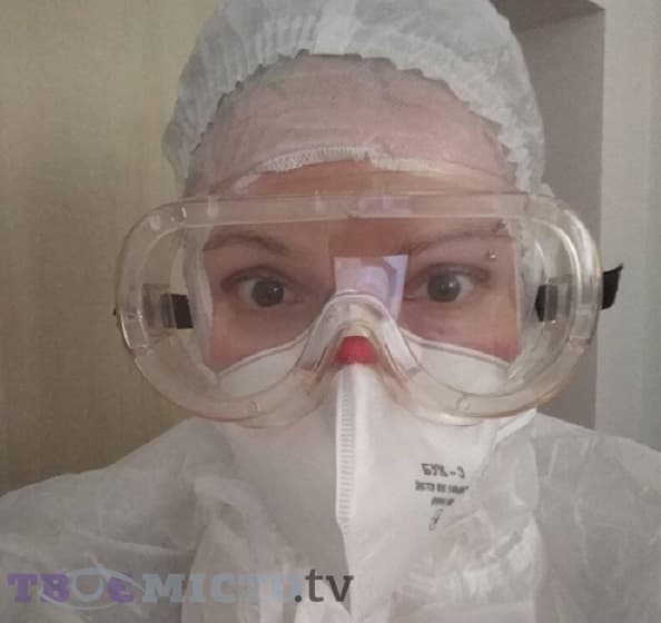 Лікарі, розповідає завідувачка 1-м пульмонологічним відділенням ЦЛЗ Надія Рудницька, працюють у повному захисті по 5-6 годин: приймають пацієнтів, оглядають, «слухають». А пацієнти, додає вона, поступають «пачками». Надія Рудницька під костюмом вдягнена у простий літній сарафан. Окрім нього видно сірі очі за пластиком щитка.