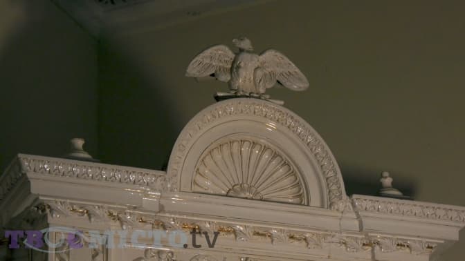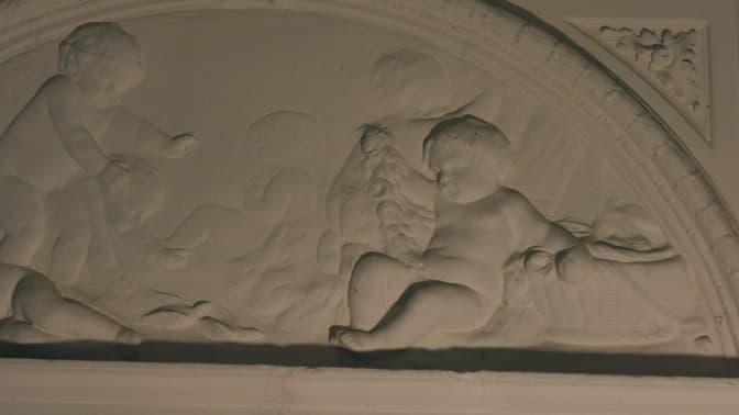 Наступна кімната, що якраз поруч із п’єцом, була дитячою: зрозуміти це можна по ліпнині на якій бавиться малеча. Петро Гринюх показує унікальну річ: єдину фреску, що збереглася від часів митрополита Андрея.