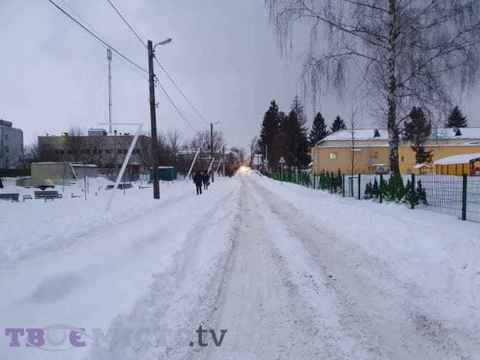 На вулиці Сухомлинського знаходиться школа №29. Тут також купи снігу, лиш доріжка до школи та обабіч розчищені. Тротуар для пішоходів протоптаний самими людьми.