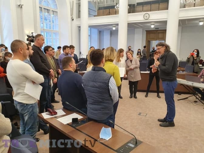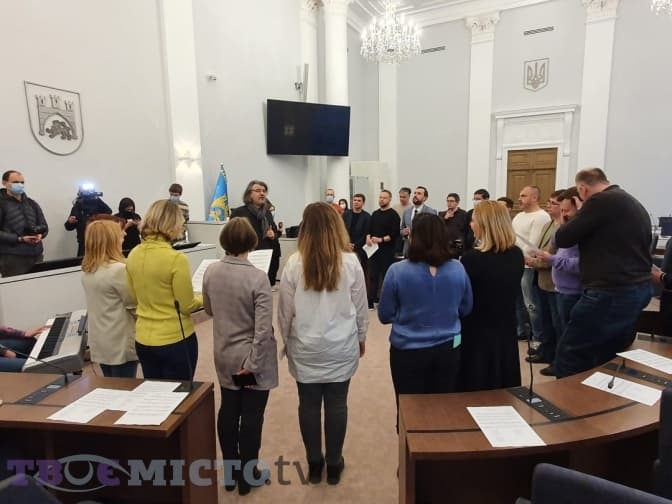 Сьогодні, 4 березня, у сесійній залі Львівської міської ради відбулася перша репетиція новоствореного депутатського хору. Деригентом хору став керівник львівської національної хорової капели «Дударик» Дмитро Кацал.