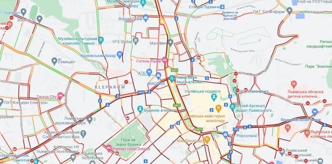 Через негоду по цілому Львову утворилися затори. За реальною картиною можна прослідковувати на Google Maps.