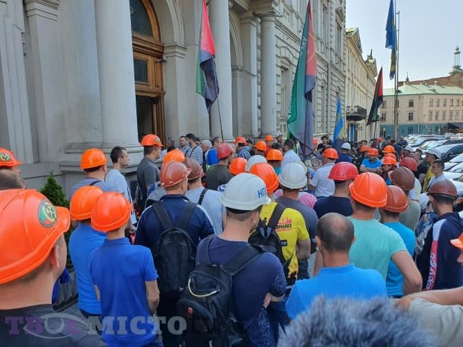 Сьогодні, 4 серпня, шахтарі ДП «Львіввугілля» протестують через заборговану зарплату. Вони скандують «Зарплату!» та «Ганьба!», а також б'ють касками по землі.