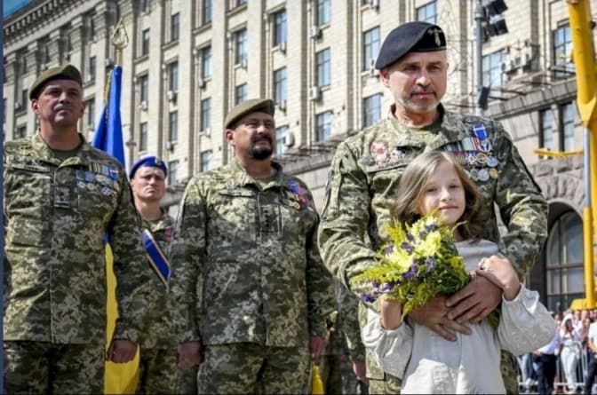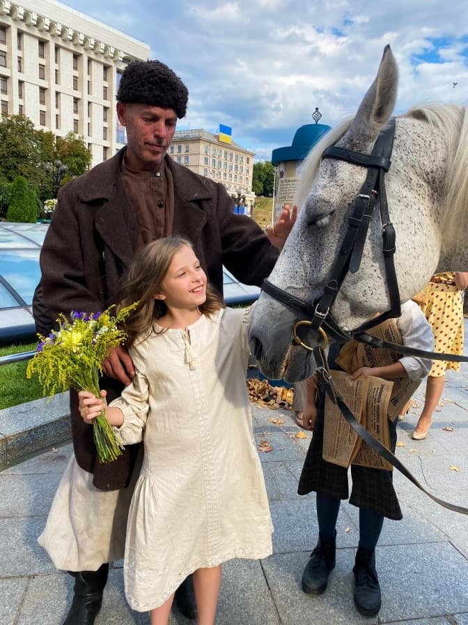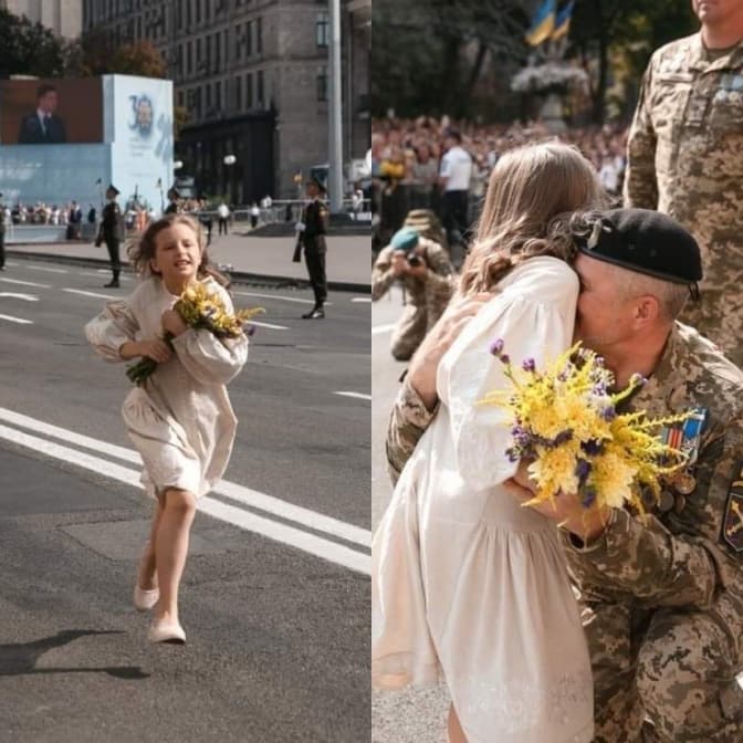 Зазначимо, що за сценарієм вистави на параді, дівчинка з букетом польових квітів, яка уособлює Україну, проходить повз людей і декорації, що символізують різні історичні періоди нашої країни. У кінці перформансу вона підбігла до колони українських захисників і вручила квіти військовому – підполковнику запасу Володимиру Федечку.