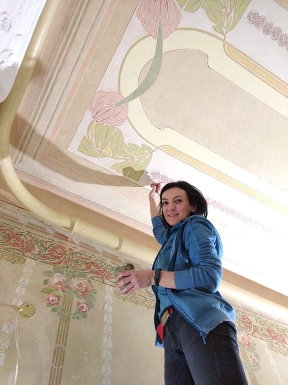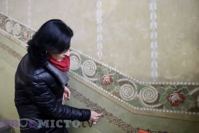 Важливо не домальовувати жодних елементів. Професійна реставрація полягає в тому, аби доповнювати тільки там, де бракує шматка або ж цілої частини. Цікаво, що головними відтінками живопису в будинку на Лисенка є охристі, золоті кольори. Це притаманний живопис сецесії. Однаковий стиль можна побачити в усьому – розписи на стінах і стелях, завитки на перилах, краплі на дверях, і навіть ковка, столярка, елементи на плитці.