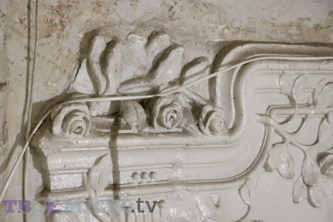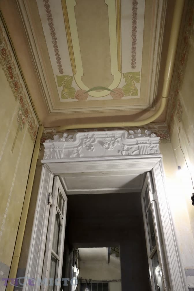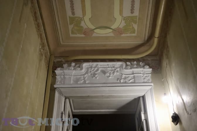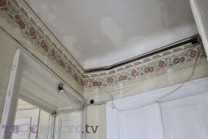 «Головна стеля була в дуже поганому стані – частково під забілом, частково працівники її здерли, була катастрофічно знищена, бракувало елементів. Я не до кінця розуміла, що там має бути намальовано. Допомогло те, що в різних кутках були фрагменти, фактично, збирала зі шматків. Сецесія повторюється в деяких брамах. Тому така реконструкція зібрана з малих клаптиків», – каже пані Ірина.