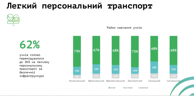«Також ми побачили, що користування шкільним автобусом зросло до 10%. Ми дослідили питання легкого персонального транспорту і 60% учнів сказали, що готові ним користуватися, якщо створять певні умови. Найбільше заохочення з Личаківського та Залізничного району. Також з'ясувалося, що в Личаківському районі є потреба у велоінфраструктурі», – каже Тетяна Приходько.