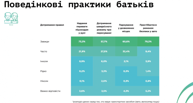 «Також важливі поведінкові практики батьків. Насправді, є проблеми із водіями. Для нас важливо було дізнатися, чи батьки не лише спілкуються з дітьми про правила дорожнього руху, а чи самі дотримуються правил. Наприклад, 6% дорослих людей не користуються пасками безпеки. І це показує дітям, що це нормальна практика. Кожен десятий із батьків-водіїв зізнався, що може перевищувати дозволену швидкість за кермом», – говорить Тетяна Приходько.