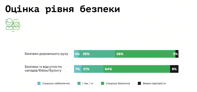 За її словами, дорога – це не лише про інфраструктуру, але й про соціальну поведінку, оскільки третина учнів зіштовхувалася з проблемами та конфліктами з водіями на дорогах. Частіше – це трапляється серед дітей 14-17 років. А кожна п’ята дитина відчуває певний страх, що на неї можуть здійснити наїзд.