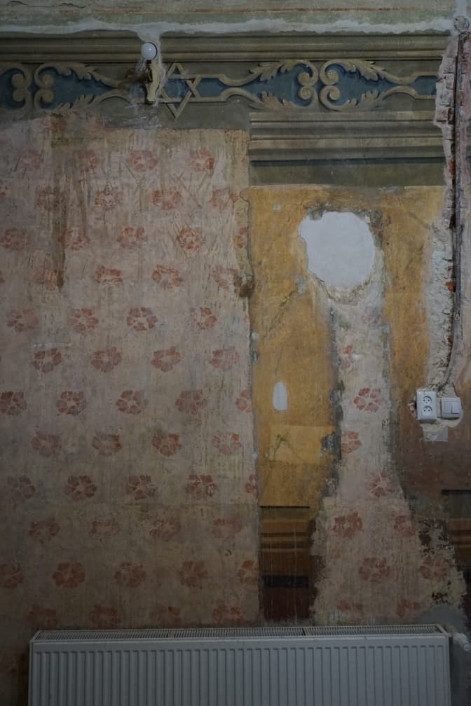 «Тут декілька шарів. Це квітки, які бачимо на стелях, і по цих квітах йде розпис зірками Давида. Всі фахівці з єврейської спадщини, які до нас заходили в гості, теж говорили, що це синагога, молитовний дім, що це приміщення має важливе значення. Ми би хотіли насправді, окрім цих шарів, показати нашарування історії, які тут були в різні періоди. Бачимо радянську ялиночку, різні шари побілки, яка була в радянський період, і ми б хотіли, щоб вони були, щоб було видно історію цього будинку», – каже директорка Ольга Гончар.