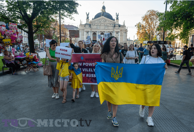 У центрі Львова, сьогодні, 5 серпня, зібралися рідні захисників «Азовсталі», щоб нагадати про полонених бійців, теракт в Оленівці та публічно закликати світ звільнити їх.
