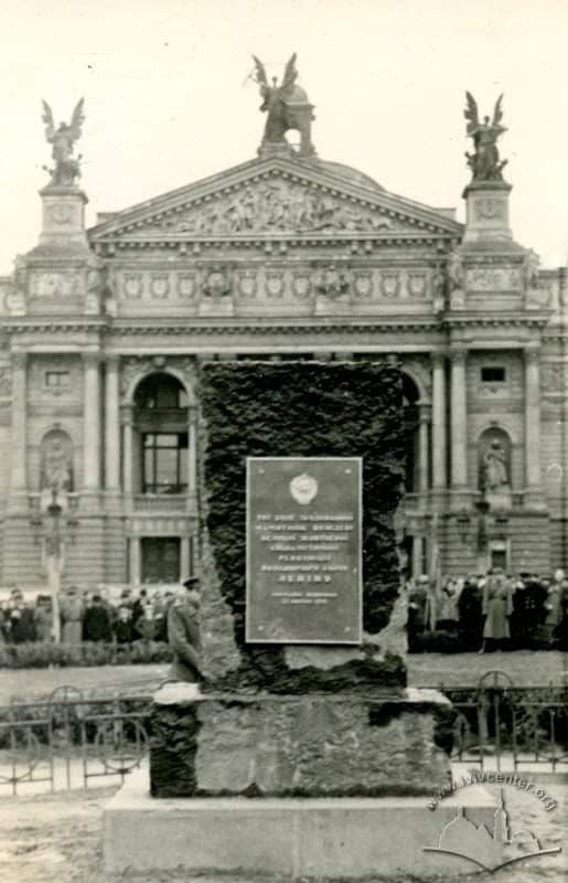 Зверху на кубі розташовувалася чаша, схожа до чаші на берлінській олімпіаді 1936 року. У 1944 році чашу знесли, облицювання куба зняли, але сам фундамент не зруйнували, і на ньому у 1952 році спорудили пам’ятник леніну. Авторами монументу були скульптор С. Меркуров та архітектори В. Шарапенко та С. Француз. Львів’яни жартували, що це пам’ятник коминяреві, що вилазить із димоходу. А також визначили цікаву точку, з котрої слід було фотографувати цей монумент. Голова леніна візуально ставала на одну лінію із фігурою на Оперному театрі так, щоб було видно лише кінчики крил, і тоді складалося враження на фото, ніби у леніна виросли роги.