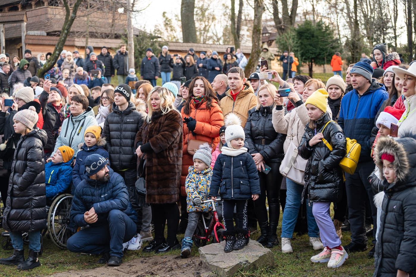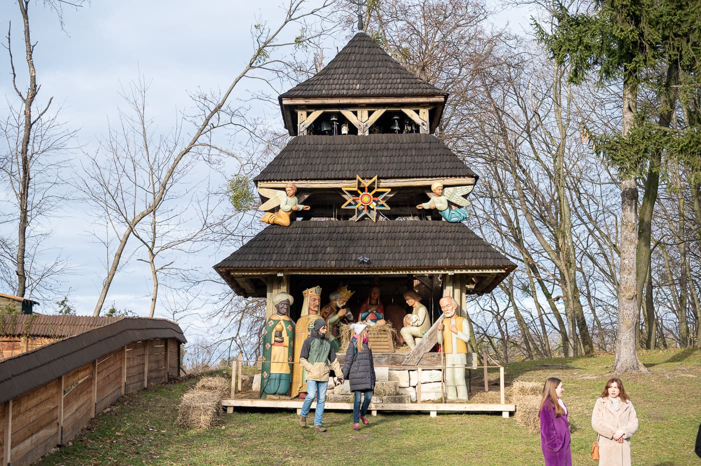 Уже біля самої брами завдяки проєкту «Набат» чути дзвони. Тут б’ють у дзвони щодня, щоби нагадувати про війну. Здалеку доноситься спів колядників. На території сила-силенна відвідувачів. Життя тут пульсує. Гості фотографуються з учасниками вертепів, насолоджуються автентикою старих хат, купують різне добро на ярмарку, зігріваються кавою або чаєм, але більшість прямує на звук дзвонів і коляд.
