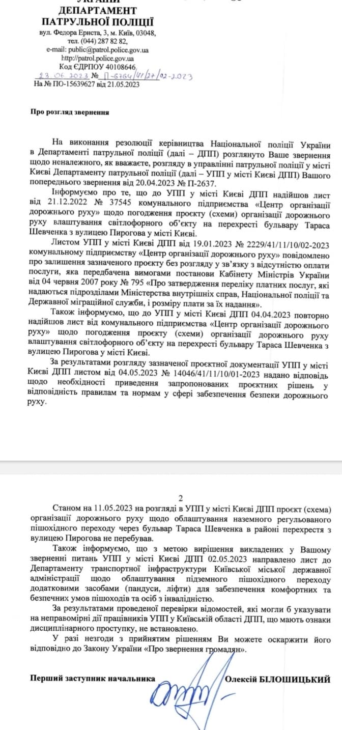 «Пасажири Києва» кажуть, що кияни роками просили про його облаштування, втім поліція чинила супротив цьому проєкту – «торік взагалі втратила проєктні документи на перехід, бо нібито «прикривала документами вікна на випадок можливих обстрілів».