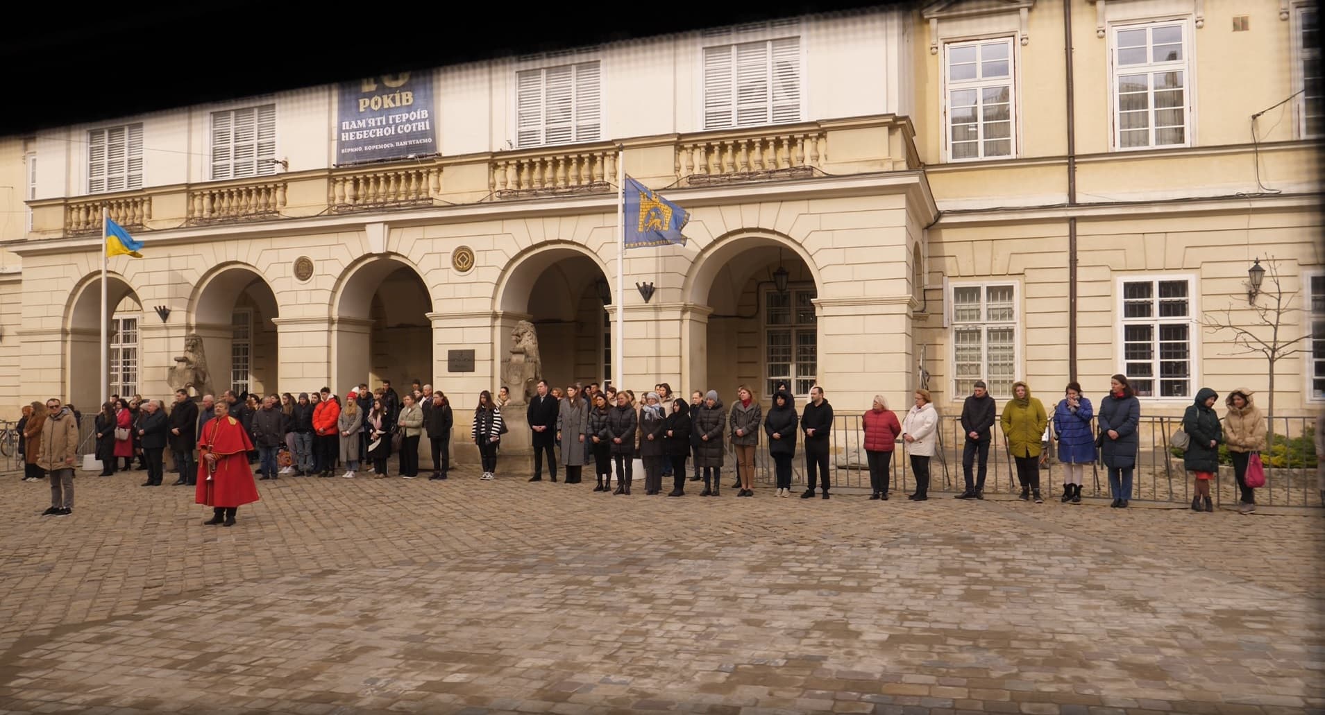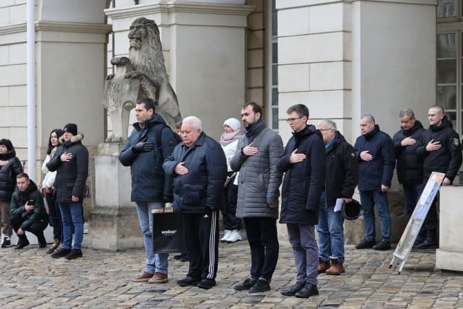 Навпроти міськради чимало людей: рука на серці, голова похилена, хтось стає навколішки. Водії виходять із автомобілів. Звучить «Тиша». Це тужлива італійська композиція Silenzіo, яку виконує міський сурмач.