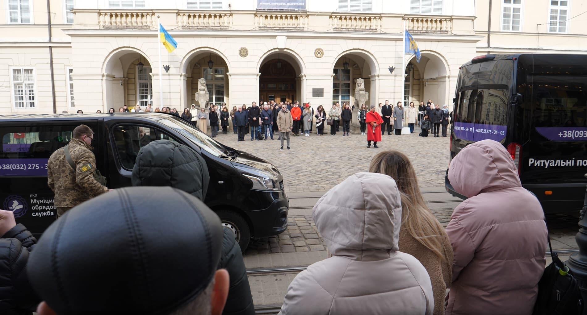 Люди несуть квіти, вінки, роблять півколо навпроти входу до храму. На своїй постійній позиції перебуває військовий оркестр, чорні автівки з написом “Комунальна ритуальна служба”. Тишу перериває військовий оркестр.