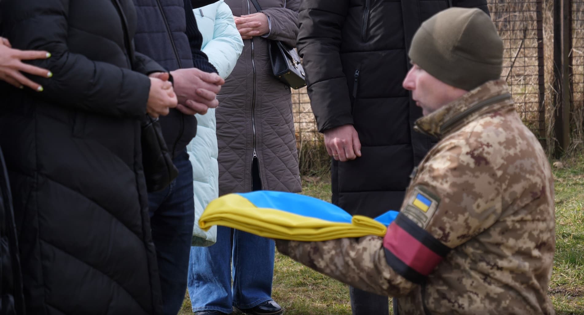Їхній командир віддає честь, відтак стає на коліно перед матір’ю загиблого Героя і передає їй стяг, яким була вкрита домовина. Ледь чутно промовляє слова подяки.