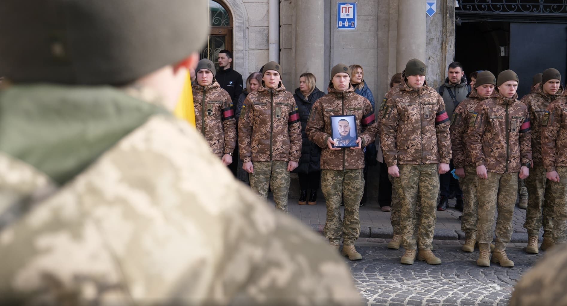 На площу Ангелів стікаються люди. Поспішають лише молоді хлопці в «пікселях». Це курсанти. Сьогодні їхня черга нести домовину, хрест, формувати колону. Частина з них вишиковується вздовж вулиці. Ще шестеро нестимуть труну. Стоятимуть у церкві незворушно коло деревяних хрестів з іменами загиблих.