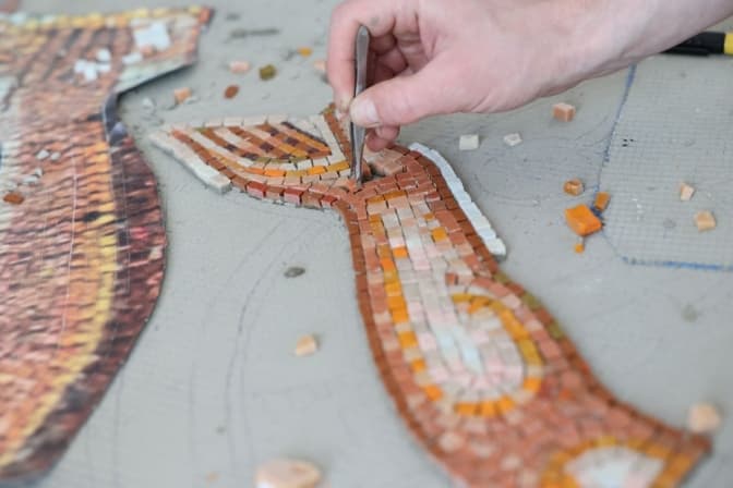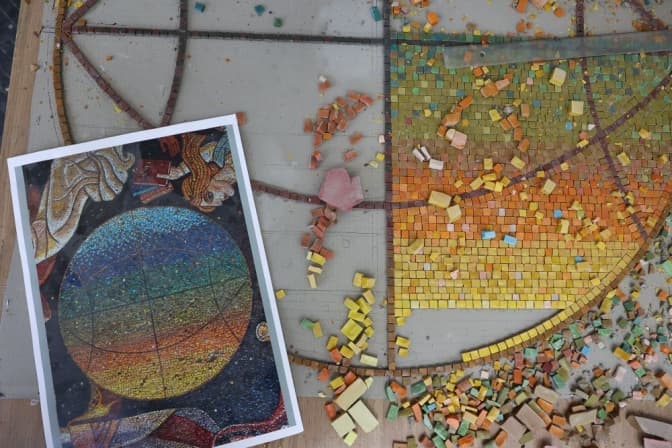 В облаштованій у цьому ж приміщенні майстерні кожен з них створює окремий елемент панно, який вже потім переносять на стіну. Керівник робіт, художник, викладач Львівської національної академії мистецтв Василь Сивак розповідає, що такий спосіб відтворення мозаїки застосовують для того, щоб пришвидшити процес та зробити його більш якісним.