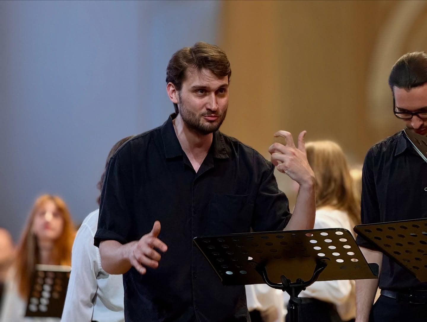 Вадим Яценко: Хто я такий? Я Вадим, стараюся бути хорошим татом. У мене крутий малий. До Львова я переїхав у 2018 році, одразу після закінчення Київської консерваторії, якщо одним словом, то я диригент, не співак. Головний хормейстер Львівського оперного театру, художній керівник хору “Гомін”, якому понад 30 років, хоч в оновленому складі він виступає близько двох років. У березні 2023-го це ще був чоловічий хор. Тоді мене запросили як диригента зробити програму. Було прохання від керівників Львівського органного залу трішки “розкачати” хор. Тарас Демко та Іван Остапович запрошували різних диригентів. Наша співпраця розпочалась у березні, а вже у серпні мене неофіційно представили як художнього керівника.