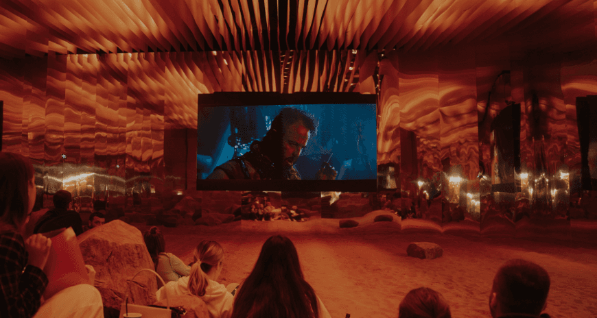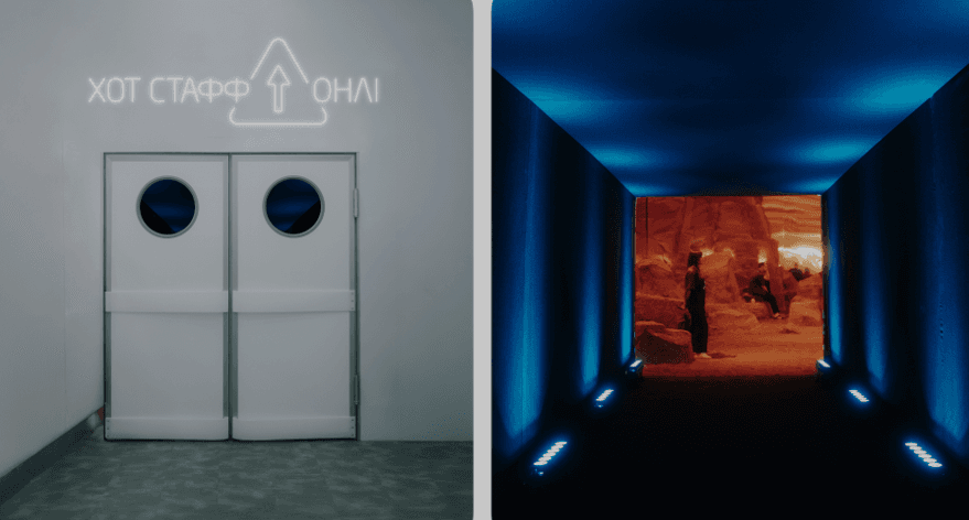 Одразу з залу із продуктами – у паралельний світ. На заправці працювала секретна кімната для показу кінофільмів, стилізована під пустелю. На підлозі справжній пісок, а замість місць для сидіння – скелі. На стінах та стелі – дзеркальні панелі, тож складалося враження, ніби цей простір нескінченний. А на екрані показували фільм «Шалений Макс. Дорога гніву».