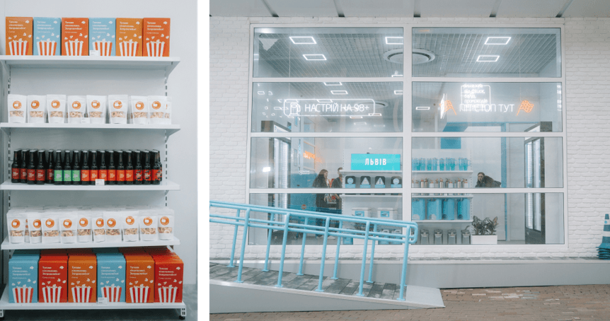 А що ж всередині? Одразу з фудкорту відвідувачі поп-апу потрапляли у мінімаркет з ексклюзивними товарами: дорожніми знаками, склоочищувачами для гарного виду з вікна, каністрами для емоцій, футболками з написами. До речі, останні також кастомізували: на вибір було 5 фраз, які наносили на футболку просто при вас.