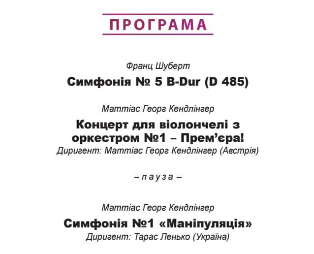 Симфонічний оркестр «K&K Philharmoniker» 24 червня у приміщені Львівської філармонії запрошує на вечір симфонічної музики, під час якого відбудеться прем’єра концерту для віолончелі з оркестром №1 Маттіаса Георга Кендлінгера. Початок конуерту о 19:00.
