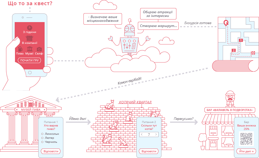 «Наша гра – це мобільний додаток, який ви відкриваєте в туристичному місті, кажете йому, скільки маєте часу, з ким ви, що вам цікаво, а він створює для вас маршрут-екскурсію. Ви не отримаєте її одразу, а тільки перший пункт. Коли прийдете в нього, роздивитесь навколо і зробите фото, – треба буде відгадати загадку – а тоді ви отримаєте наступний пункт, і так далі», – зазначають творці додатку.
