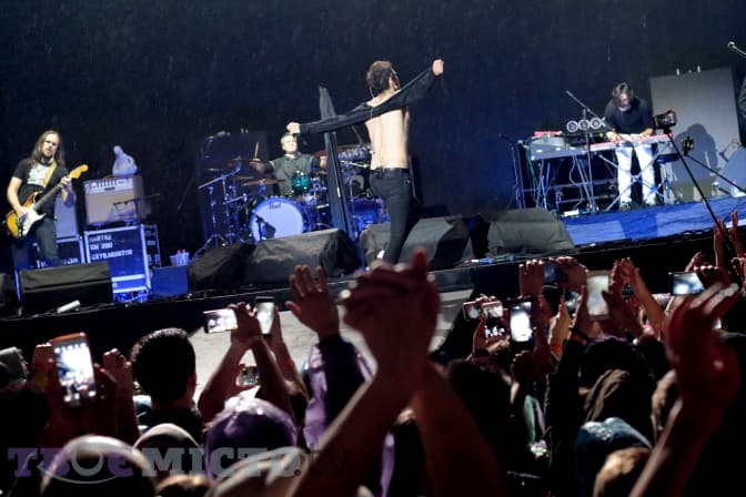 П’ятий виступ гурту на «Арені» – вчетверте йде дощ. Та публіці у фан-зонах це байдуже. Лише після кількох пісень де-не-де з натовпу вигулькують парасольки, а більш практичні глядачі одягають сині дощовики. На трибунах під накриттям зміни погоди, здається, взагалі не помітили.